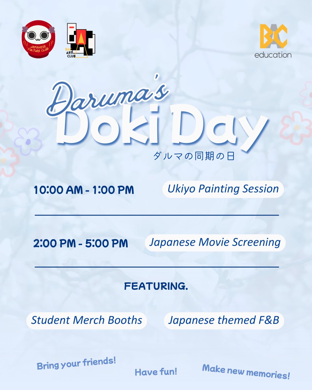 This year, in collaboration with the BAC Art Club, JCC’s flipping the script and celebrating friendships, new connections, and all the heart-racing doki doki moments at Daruma’s Doki Day!